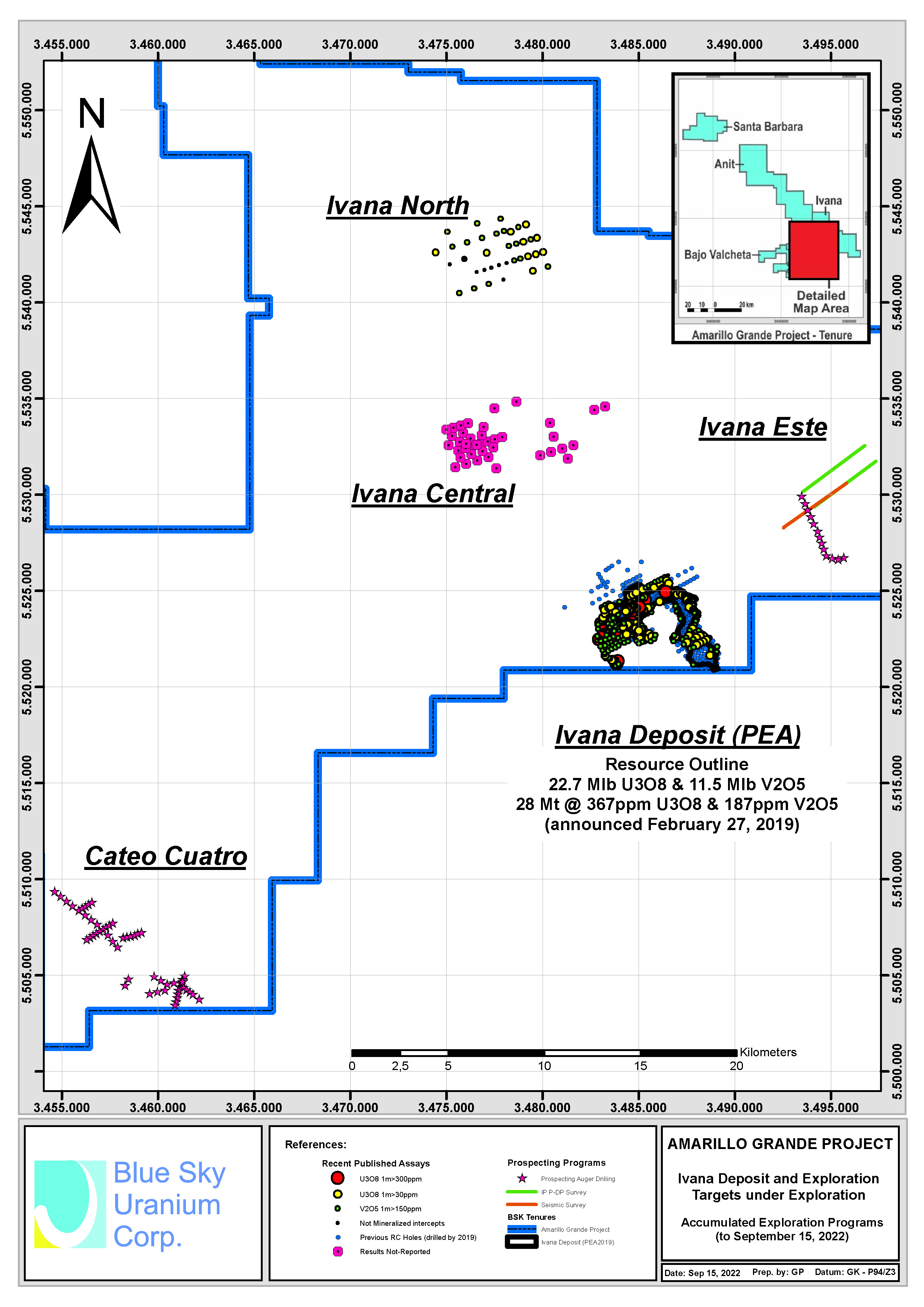 Se espera que el trabajo de exploración adicional y los estudios de ingeniería de detalle amplíen y mejoren los recursos minerales, y optimicen y mejoren aún más la economía del depósito de uranio y vanadio Ivana. Blue Sky continúa la exploración próxima al depósito Ivana y en todo el proyecto Amarillo Grande.