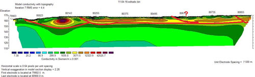 Figure 1. Electrical Tomography Section Showing Interpreted Paleo Channels in Red