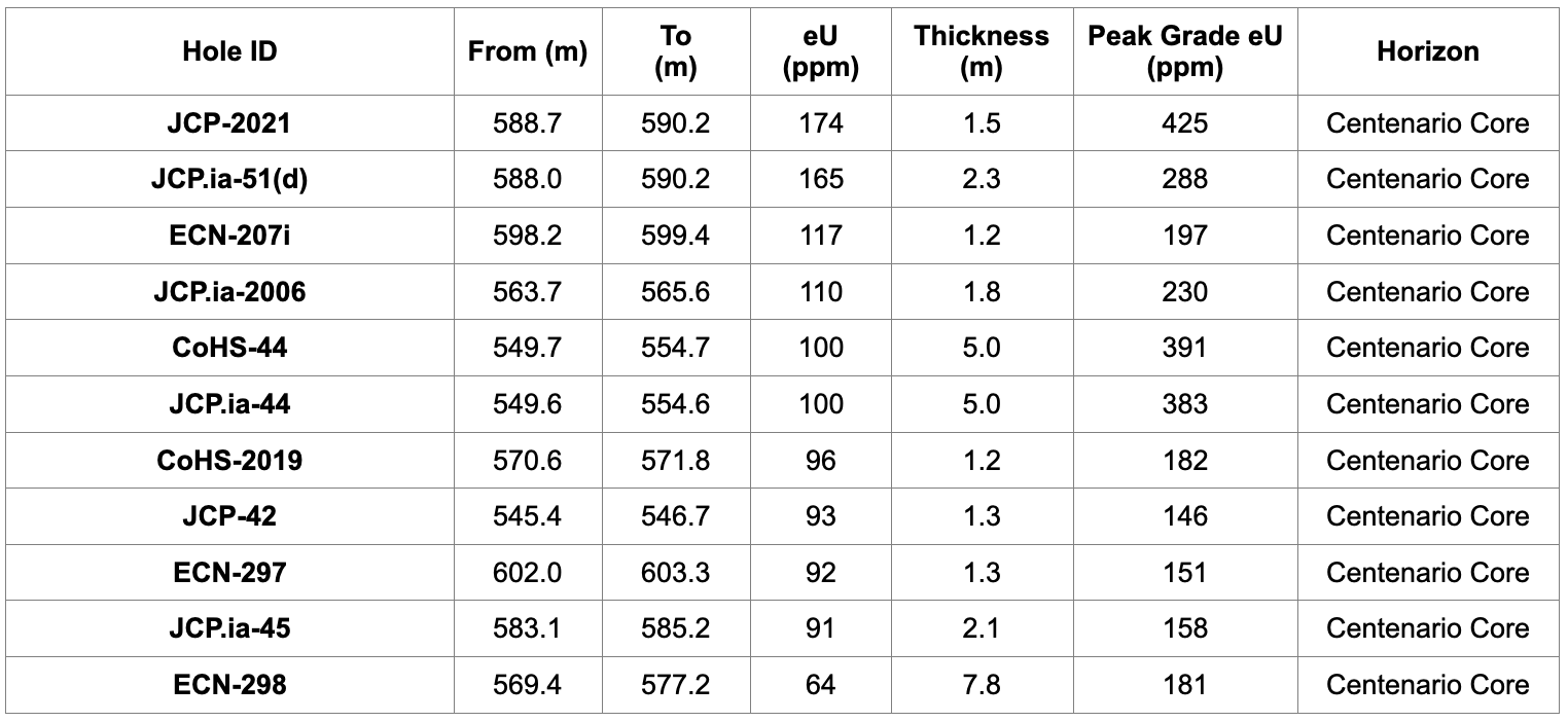 Table 1. Summary of Drill Holes with Most Significant Intervals of Anomalous eU