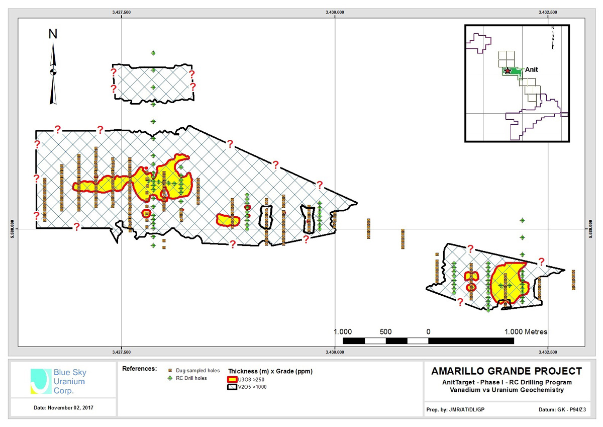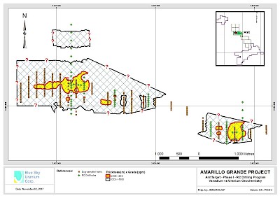 The Phase I reverse circulation (“RC”) drill program completed in 2017 included 1,170 metres of drilling in 83 holes, with a maximum hole depth of 20 metres. The program successfully confirmed the spatial correlation of the previously recognized mineralized zones, and led to the delineation of a significant area of vanadium mineralization, covering a much larger area than the previously defined uranium mineralized zone. This vanadium zone measures approximately 3 kilometres by 1 kilometre with thicknesses between <1 and +16 metres and grades ranging from 0.026% and 0.341% V2O5 (259ppm and 3,411ppm V2O5 respectively), using a 0.1% V2O5 x metre isocurve as a lower limit.