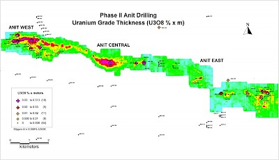 The Anit property was a grassroots discovery by Blue Sky in the centre of the new uranium district. The discovery was made during follow-up of results from the 2007 airborne radiometric survey that identified a 15 kilometre-long, and locally up to 1.5 kilometres wide, anomaly in the area.