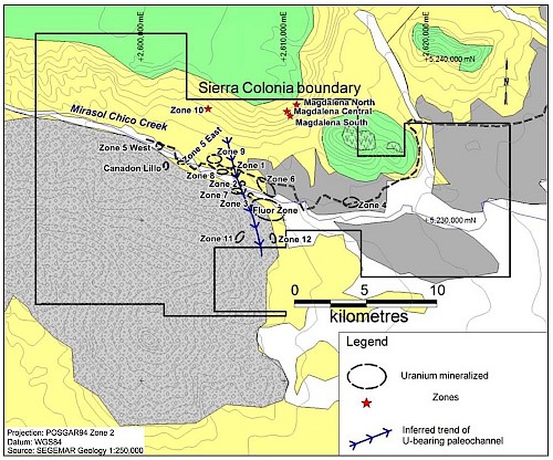 The Sierra Colonia project was selected following recommendations by Dr. Jorge Berizzo, Blue Sky's geological consultant, and was based on superficial radiometric anomalies within a similar geological environment as observed at the CNEA's Mirasol uranium occurrence which is located five kilometres to the south.